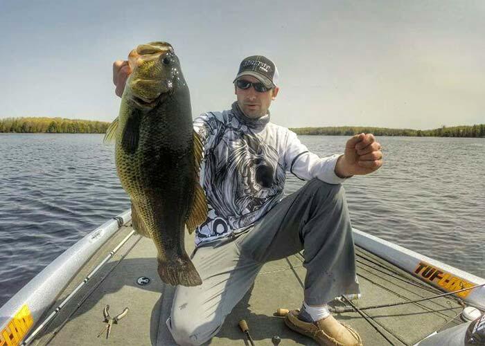For fishing areas that are a little deeper like weed-beds and rock structures and, also man-made structures like docks I have two favourites. My number one, but rigged two different ways is a Wacky rigged or Texas-rigged soft plastic stick worm like a Yum Dinger. A wacky rig just means you place a small hook directly in the middle of the worm, and a Texas rig means using a bigger wide gap hook to make the bait weedless; adding a worm weight in front of the bait will help in deeper water and penetrate the cover. Lastly, a skirted jig with a soft plastic crawfish trailer, like a Northland Jungle Jig, can be used in all these areas.