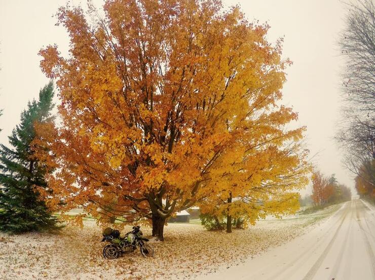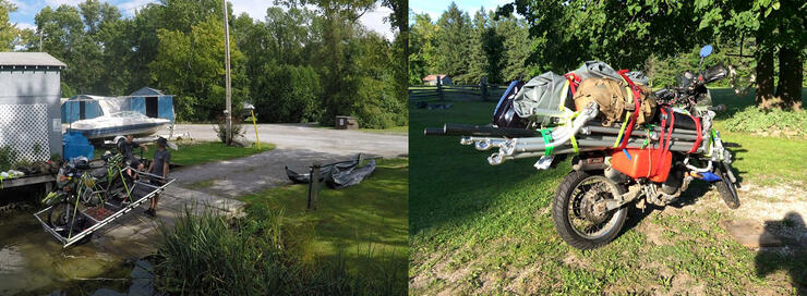 According to Brokentooth, the boat “handles like three sheets of plywood with a motor hanging off the end.” Which means on windy days he’s got to hole up at a campsite or motel and wait it out. When he can’t float the boat, he rides the bike. Using a z-drag kit to haul the Kawasaki off the pontoons, he packs it all up and away he goes.