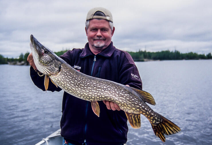 Stretching for approximately 8 km, Irregular Lake has an erratic shoreline and myriad rocky islands and shoals. The water is clear with a brownish-green stain. Submerged sandbars and reefs strewn with stones and boulders lie adjacent to drop-offs, rock walls, and weedy bays. Northern pike, muskie, whitefish, and cisco abound. On the first shoal we fished, Gene was quickly on a fish. The mid-teens muskie put up a spirited battle. “That was fun,” Gene said with a broad smile.