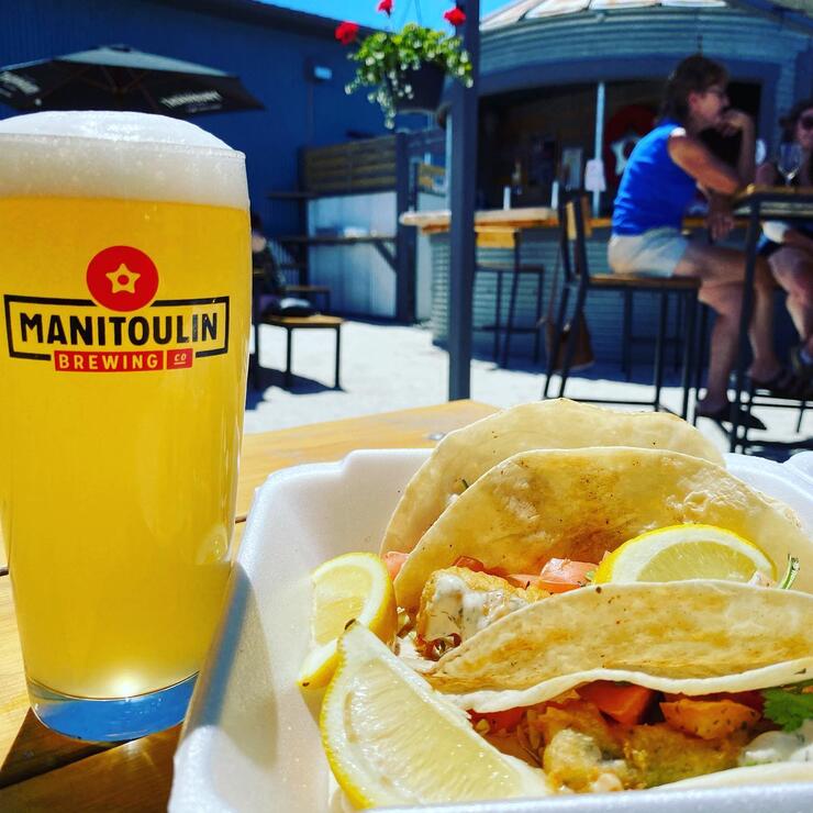 Whitefish tacos and a cold beer on the Manitoulin Brewing patio