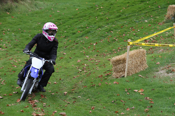 Refreshments were available as riders stayed for the Brat Track 110 Invitational, where special guest riders raced on a makeshift track against each other on Yamaha TT-R110E mini bikes to earn bragging rights and a customized trophy fabricated by Rob. Yours truly joined the fun and put my childhood dirt bike skills to good use.