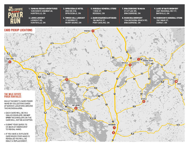 We grabbed our next two cards at Muskoka Brewery and Bracebridge Yamaha before heading to Lake of Bays and Baysville along 117. A visit to Lake of Bays Brewery awarded us one last card before our time ran out. We cruised back to Huntsville along Highway 2, admiring the fall colours and leaves that draped over the road.