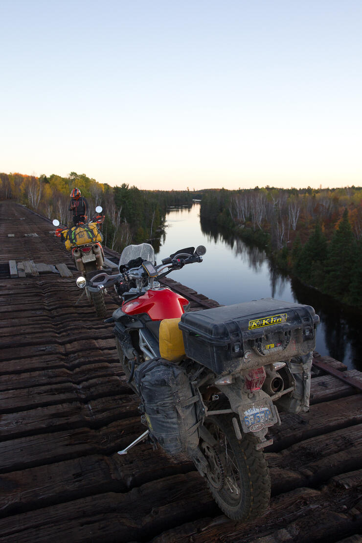 It's six pm and we're fueling up in Capreol, both petrol and coffee. Eight hours in the saddle so far and not done yet. We hit the old rail trail at dusk. Crossing the old rail bridge high above the river is cool. The whoops and sudden sections of deep, loose stone that scares the shit out of you, not so much. We drop our bags on the hotel room floor in North Bay, 10 pm... a long day.