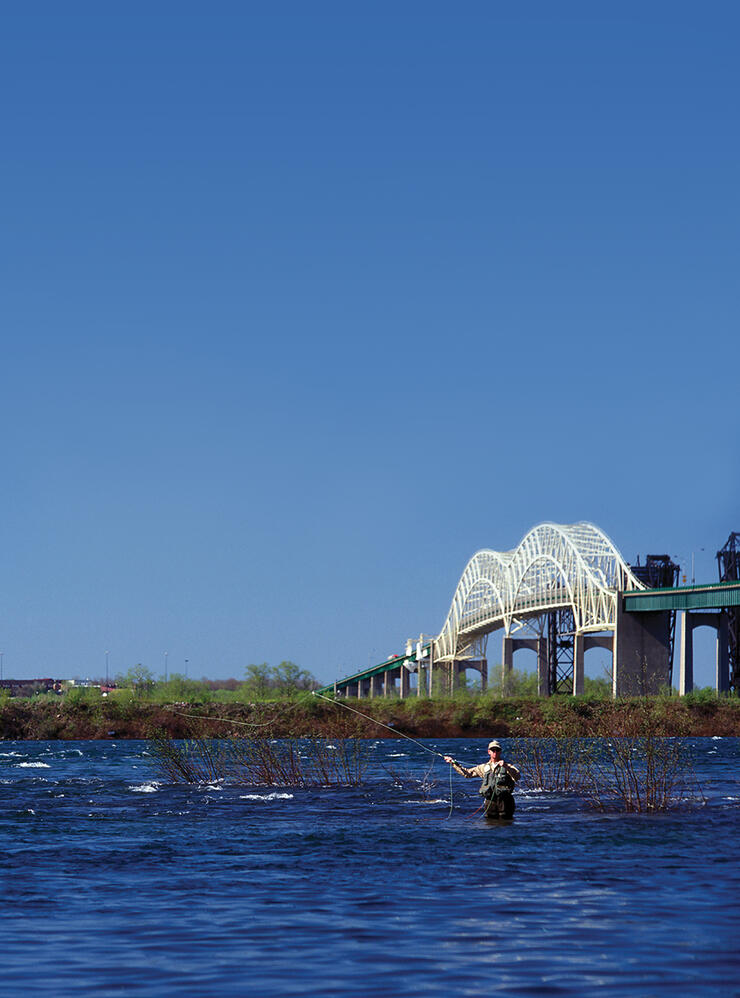 The river forms a connecting channel between Great Lakes Superior and Huron, and tumbles six vertical metres over a one-kilometre stretch beneath the towering arches of the International Bridge. Champagne-clear water cascades over sandstone shoals, whirls around boulders and gushes through chutes. Today, locks on the Canadian and U.S. sides of the river enable pleasure craft and freighters to bypass the wild water. The whitewater straddling the international border, meanwhile, is a dreamscape for anglers, with each season of the year presenting different challenges and a variety of fish species to catch.