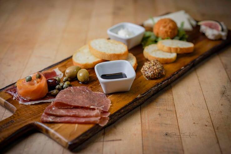 Try the Charcuterie board that features bresolo, smoked duck prosciutto, orange & whisky cured salmon, duck/soy reduction, deep fried blue cheese panko ball, smoked gouda, brie, lemon-dill cream cheese, grainy mustard, olives, and bagel crustinis. So good!