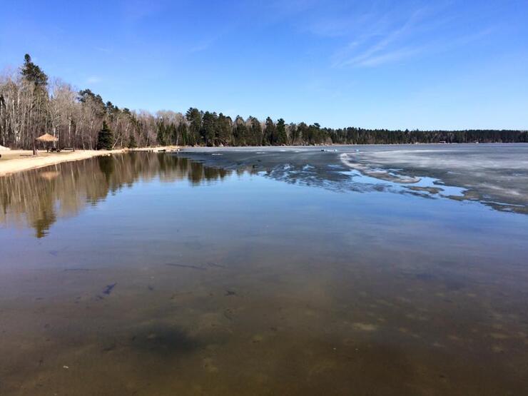 There is lots of open water along the shore and the ice is looking very black. This is the beach at K.C.'s Landing Resort on Edward Lake. UPDATE: Official ice-out day was April 27 on Edward Lake. Cedar Lake should follow close behind. For more updates on Clark's Resorts and their outpost lakes follow their Facebook page.