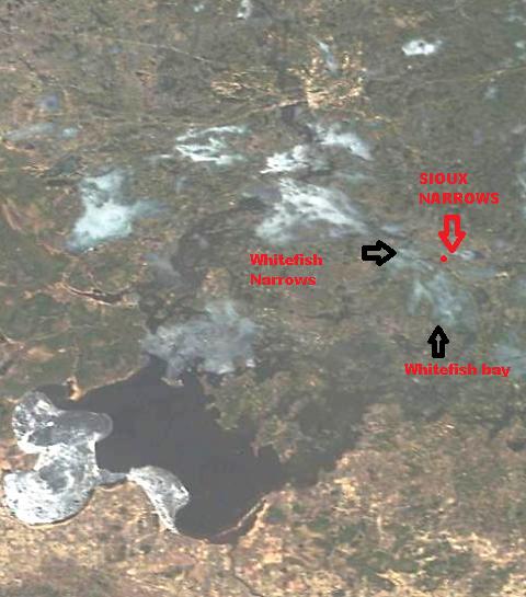 Here's a satellite photo from April 26 of Lake of the Woods marked by Crawford's Camp in Sioux Narrows. Matt has labelled some major points in Whitefish Bay. You can see that some areas to the MN border are open and ready but around Whitefish Bay we are still covered in ice. Areas around Whitefish Narrows, Snake Bay, Knickerbocker Inlet, Sioux Narrows Bridge, Reed Narrows Bridge, Some areas of Long bay are all open. Whitefish Bay is covered as of yet. But this is promising. If we can get a little weather then this will open right up.