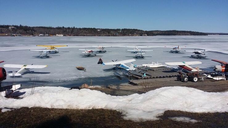 I look at this photo and think of kids waiting in front of a candy store that's about to open. Most of the planes on the ice here in front of the Red Lake Seaplane base will take off on floats off the ice and land on the open water in the river! Howey Bay Resort right next to the base reports that as of April 27th, there's still a foot of ice on the lake.