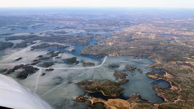 Tim went flying again on April 27 and there was definite improvements since the 25th. Looking southwest towards Clearwater Bay and Shoal Lake you can see both lakes are still pretty white though. Check out Tim's blog for more ice-out updates for the Kenora area.