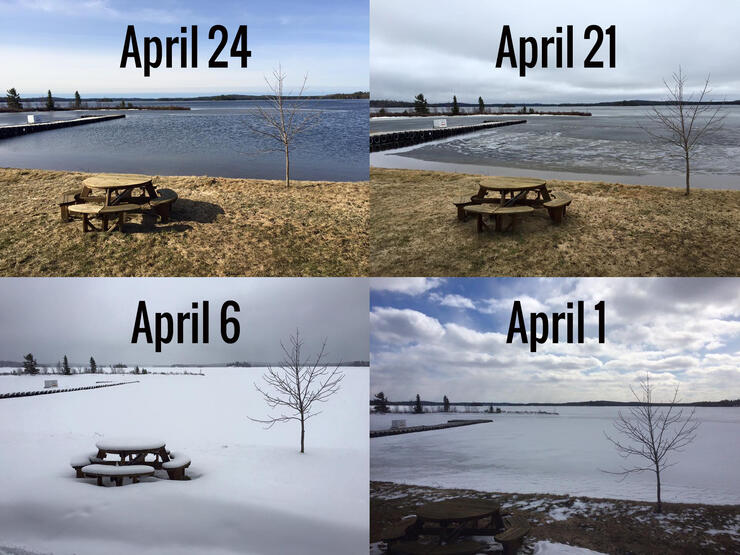 Ignace Outposts keeps everyone updated on the ice conditions on Agimak Lake where their sea base is located in Ignace. April 6 saw about 4" of heavy, wet snow! On April 24th, the lake was about half open. The strong east winds that day should have broken up and pushed the rest away. Follow Ignace Outposts on Facebook to see when their outpost lakes open up.