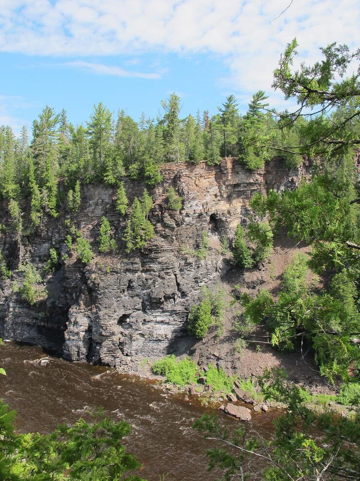 The water from the Kaministiquia River cascades a couple dozen metres on either side of a giant, roughly triangular shaped slab of black rock. Small trees cling precariously to life and are nourished by the heavy mist.