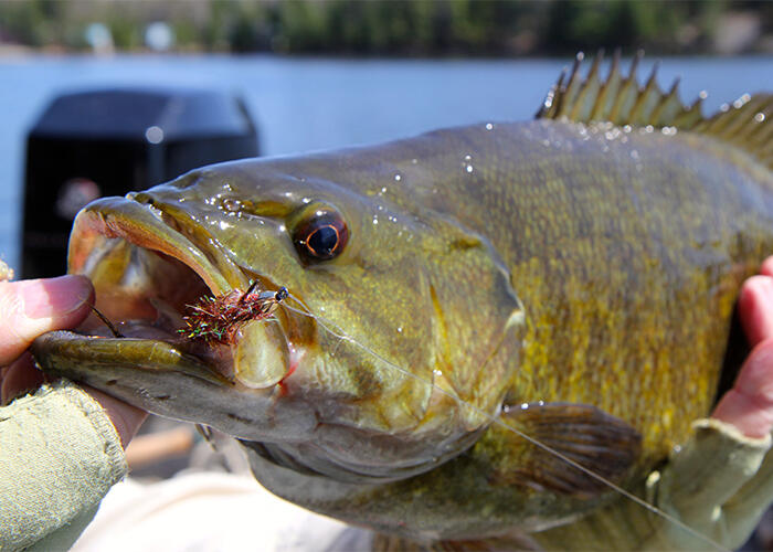 A 6 or 7-weight outfit is appropriate for Northern Ontario smallmouths. The rod should have a fast action and enough backbone to turn over big, bushy flies and handle powerful fish. The reel should have a large arbour and a smooth disc drag system. A weight-forward floating line is fine for fishing on the surface and in the top of the water column, but you’ll have to switch to a sinking line when you need to go deeper, especially from mid-summer on when the fish tend to seek the cooler water in the depths. An Intermediate fly line is perfect for this. We prefer a nine-foot, knotless, tapered leader of 8 to 10-pound test for most situations, but go up to a 12-pound test when fishing logs and structures, or anywhere that the fly might get hung up. Some recommended flies for smallmouth bass in Northern Ontario include: Gamechanger, Scotty’s McFly, Woolly Buggers, Poppers (yellow, orange and black), Muddler Minnows (1/0 size), and Coneheaded Bow River Buggers.