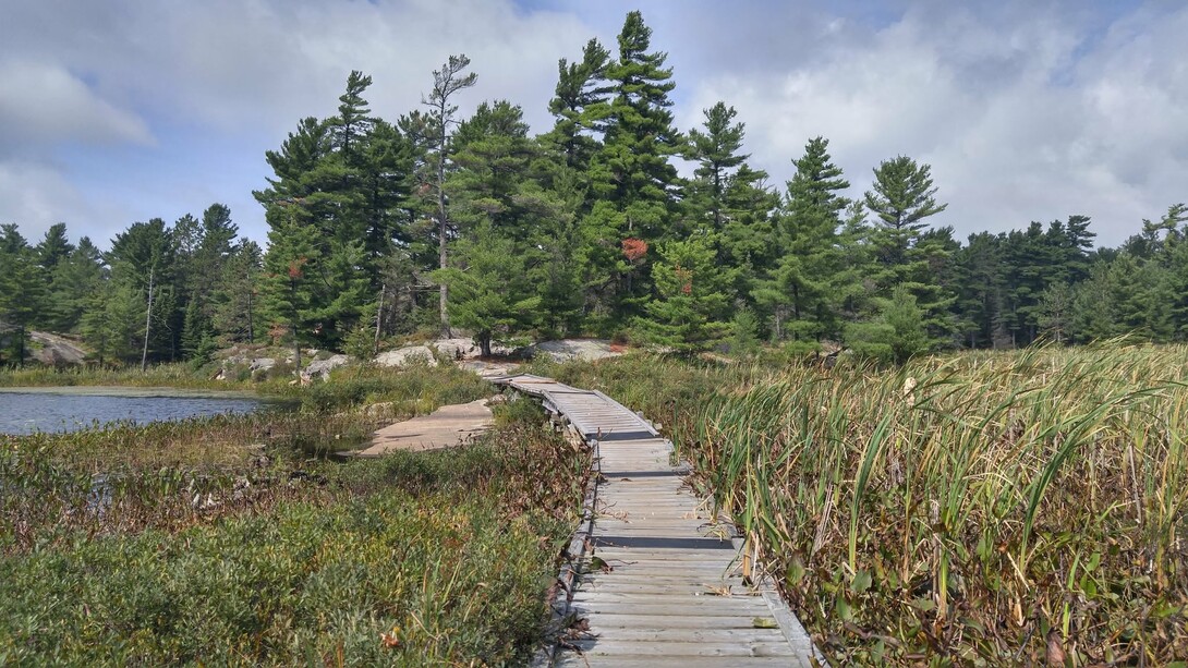 Grundy boasts four day hiking trails, ranging from the easy 1.5-kilometre Swan Lake Trail to the 5.2-kilometre out-and-back Pakeshkag Lake Trail. The 2.5-kilometre Gut Lake Trail is popular for its diverse habitats, including open Canadian Shield rocks, forested areas and wetlands. Meanwhile, the 3.6-kilometre Beaver Dam Trail passes an active great blue heron rookery. All Park trails offer excellent opportunities to observe wildlife like beaver, moose, deer and many species of songbirds.