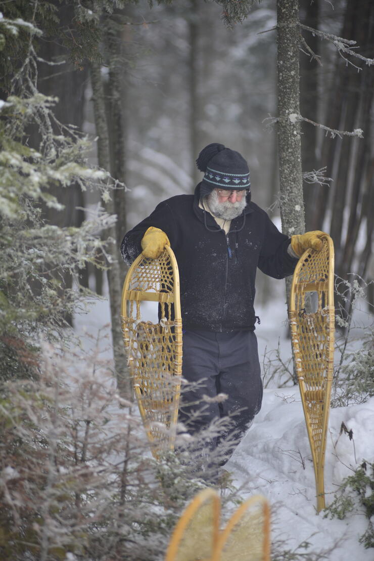 Gearing up for the trail: The larger surface area of traditional wooden snowshoes often makes them a better choice for the deep snow of Lake Superior Provincial Park.