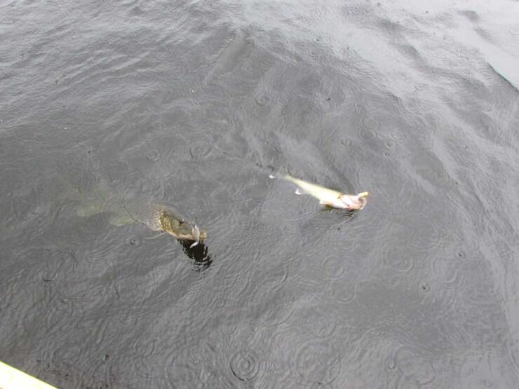 That afternoon, I landed several more good-sized northern pike, mostly using a glide bait over some of the deeper weed beds. After a great home-style fish fry, we went out and explored a little more and located another reef that was holding lots of fish, between 15 and 30 feet down. A note of caution to future guests, Tina says, “you can actually get a pretty bad case of ‘dishpan hands’ if you are constantly reaching into the minnow bucket all night, so pace yourself, or get Kyle to do it.”