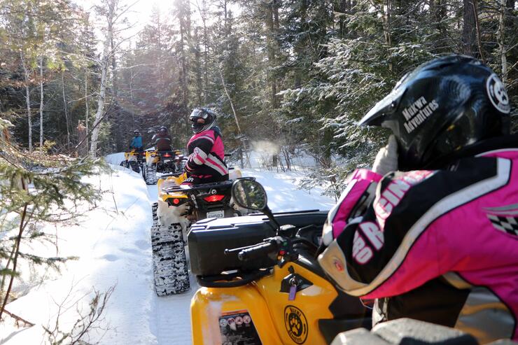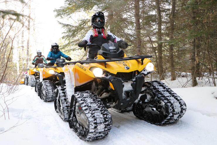 Leaving narrow ATV trails to snow machines in winter, the slower-moving Mukwa Adventures winterized vehicles take to connector trails, frozen lakes and First Nations trails that accommodate the width of ATVs on tracks. Unlike a snowmobile where you have to dress extremely warmly due to the speed and associated wind, winter ATVs move at a slower speed: “It's not a race out there; it's more about seeing the scenery,” says Trudeau.