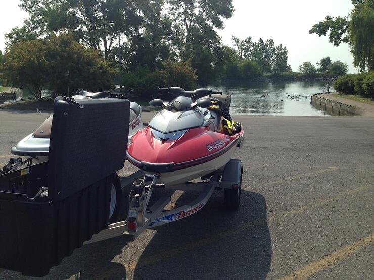 Get your tow vehicle in line with the others if there’s a line up. When it’s your turn at the ramp move smartly and deliberately. Back your trailer down the ramp, put your vehicle in park, and set the parking brake. Get your PWC and load it on the trailer. Make sure the winch strap is clipped on properly and that the winch catch is latched with the PWC correctly loaded. You don’t want the winch strap releasing as you’re pulling your trailer out of the water. Move your trailer into the staging area or choose a parking spot well away from the launch ramp. Finish securing your PWC, put your gear away, and recheck the trailer.