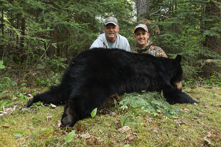 After a couple of hours in Ryan’s stand, we felt like we were experiencing déjà vu. A loud rustling from behind the stand put us on full alert. This time, the bear popped into view 30 yards behind the stand, and again, he appeared to be quite cautious. Instead of heading right for the bait, the bear did a wide circle around the stand. After a long five minutes of waiting for the bear to reappear, we caught a glimpse of him walking towards the bait, now straight in front of us. He walked in slowly and gave us plenty of time to size him up, but it was obvious pretty quickly that this was a shooter bear, one of the several Gary had on camera. Ryan calmly waited for a clean shot as the bear ate at the bait. When it came, he delivered his arrow perfectly behind the bear’s front leg and into the vitals. Not bad for a guy on his first bear hunt, his first tree stand hunt, his first crossbow hunt, and his first trip to Canada.