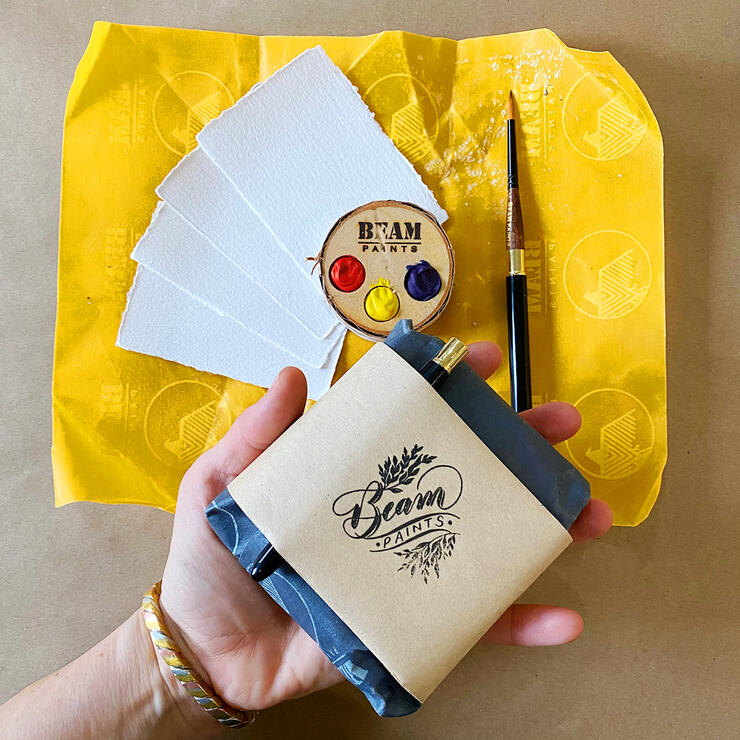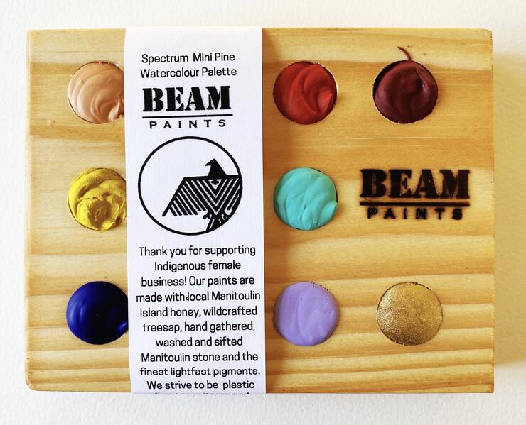 Initially, Beam actually declined to work with Chapters-Indigo because one of the vendor prerequisites is that products must be poly bagged. “We’re trying to be plastic-free, but Chapters worked with us to make it work.” Beam packages her paints in off-cut pieces of birch and cardboard with craft paper. Visually, Beam Paints don’t look like any other art supplies. “Our packaging is different. We use an image of our culture in our logo and Anishinaabe names for paints. We’re the only paint manufacturer in Canada who is Indigenous—all of it makes me smile.”
