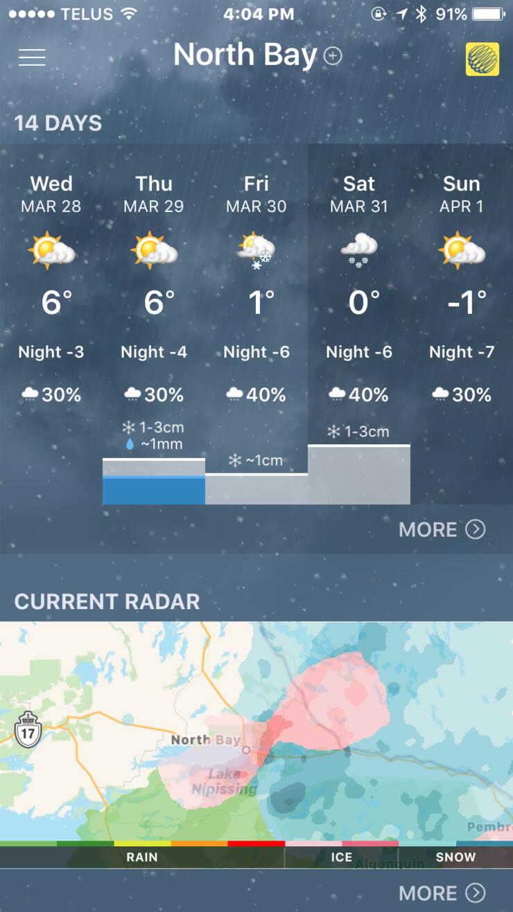 Voted Canada’s #1 weather source for a reason, some of its great features include long-range forecast, weather warnings (in the form of push notifications), precipitation start and stop times, and a radar which has a simulation that goes several hours ahead of current time to give you an idea of what’s upcoming. You also get short-term forecasts, with just about every bit of info you could want (wind speed, barometric pressure, UV report) and even trending weather-related videos.