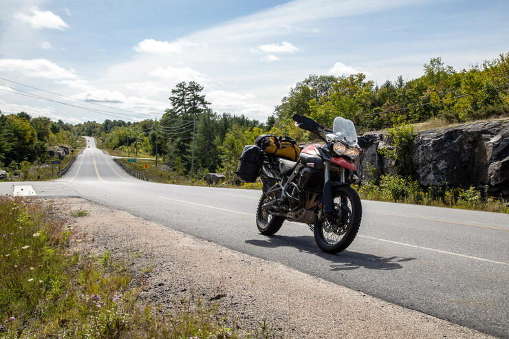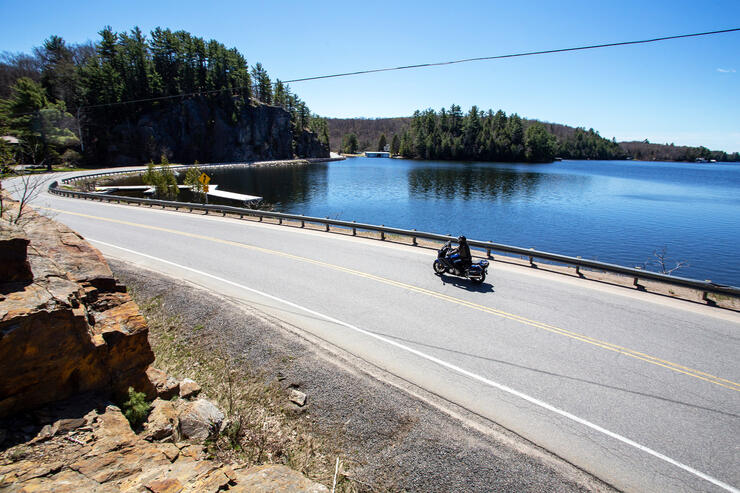 Few experiences leave a smile on a motorcyclist's face than leaning into a corner between a lake and a hard place. In this case, Lake Rosseau on one side and a towering wall of the Canadian Shield on the other. A moment of absolute emotional and visual perfection.