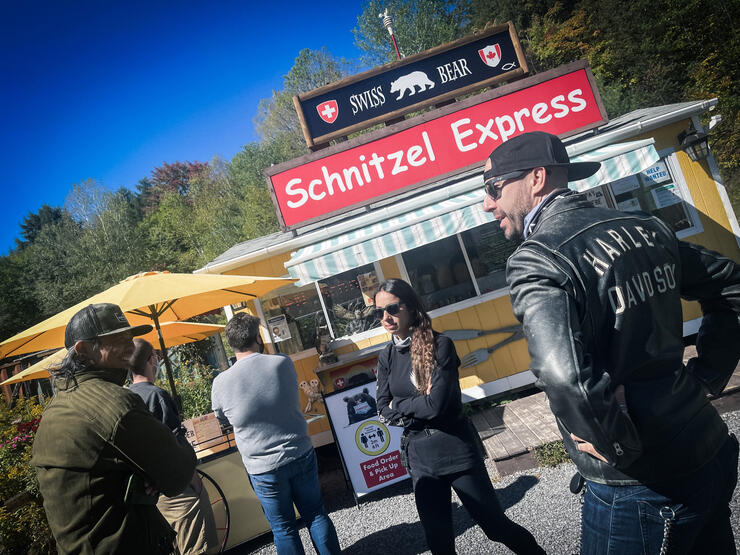 Early Sunday morning, blue skies met this intrepid bunch of motojournalists, photographers and influencers. The DVP North wasn’t a parking lot yet and the riding was easy across the 401/115/35 towards Peterborough. Predictably, late-September temps dropped as we left civilization, and by the time we stopped for lunch at the Swiss Bear Cafe in Apsley, I had to throw on the extra layer that I’d stashed in the Tracer’s sidebags.
