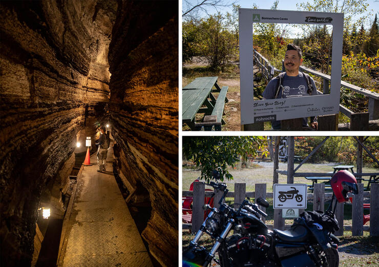 While I will take a day ride in the Highlands and Ottawa Valley any time, more is better, and with time on our hands, we can explore. Stop number one is at the Bonnechere Caves in Eganville. The site is home to a series of caves that were carved into the surrounding rock roughly between 400 and 500 million years ago. It's my first time here, and as so often is the case, you don't know till you try and touring the caves and learning about the fossils, very cool. Motorcyclists enjoy dedicated parking spots and get $1 off admission!