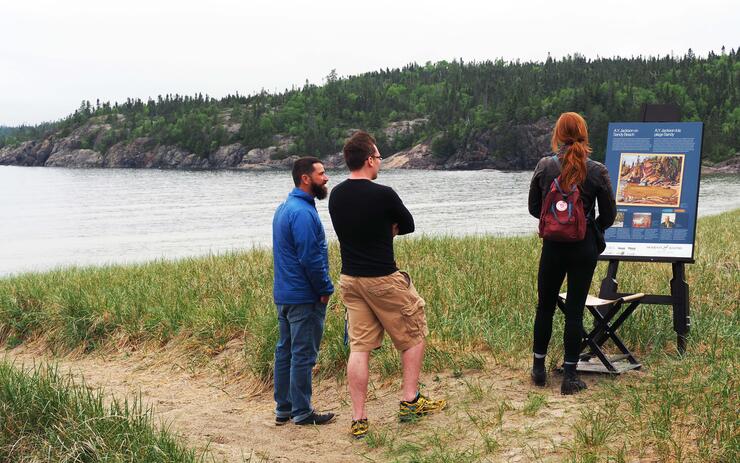 After crossing a beautiful waterfall, we arrived at Sandy Beach. The first thing we saw was the Sandy Beach Learning Pavilion. It tells the history of the early settlements and subsequent relocations over several hundred years of Michipicoten First Nation and its ancestors. It is worth taking a look and read through.