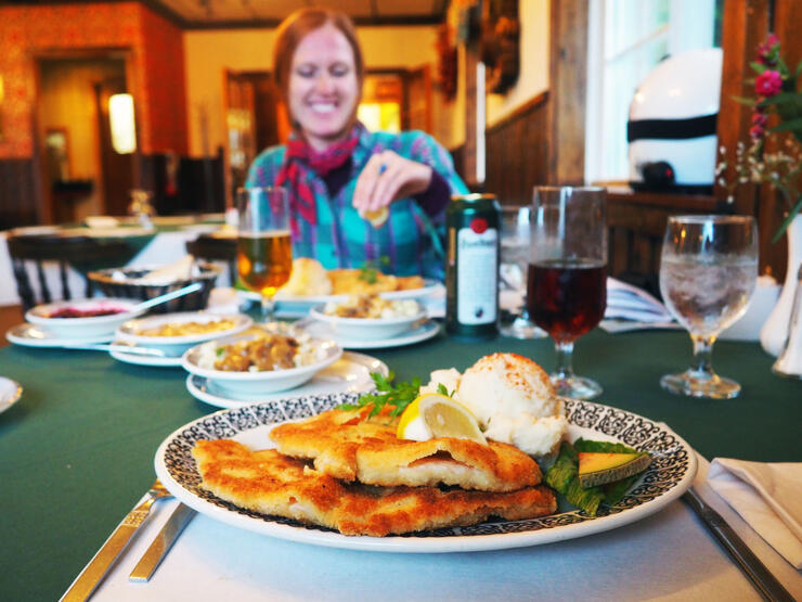 We were told it’s the best schnitzel around, so Andrew and I ordered one each with a cup of the house-made split pea soup. The soup tasted just like my mother made it—chunks of ham and hearty veg. The cranberry jam on the bread tasted like the inside of a cranberry pie. We felt at home, most of the people eating were bikers too.