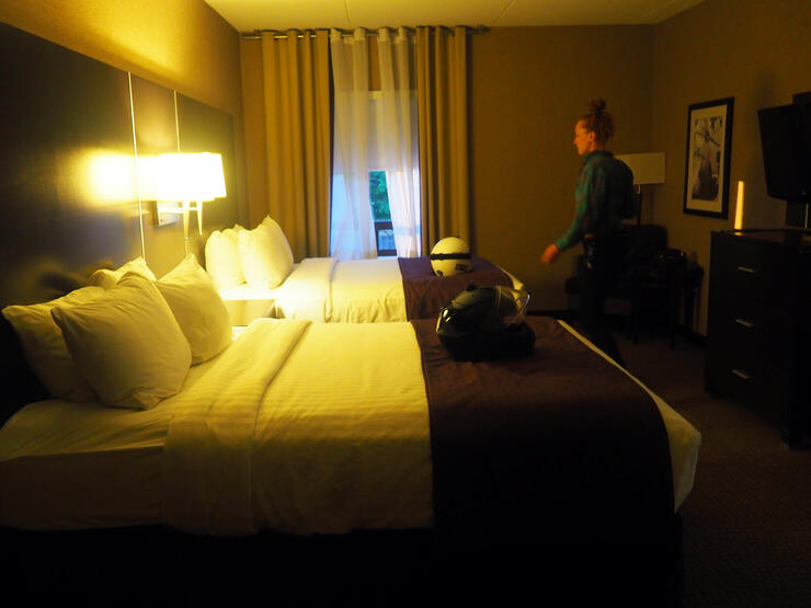We throw our bags on to our comfy queen-sized beds and let the rain put us to sleep.