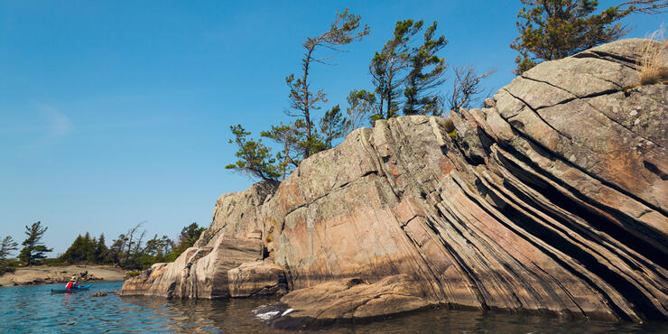 Even those not interested in geology can’t help but be intrigued by this landscape. Over 1 billion years ago, the rocks at the base of the then Grenville Mountains were buried 20 to 30 km deep, heated to extremes of 500 to 750º C and squeezed so intensely that they were chemically and structurally altered. The minerals separated into parallel bands and became pliable enough to bend and fold like Plasticine. The Grenville Mountains eventually wore away, unearthing the billion-year-old rocks that we now see along the eastern shore of Georgian Bay.1