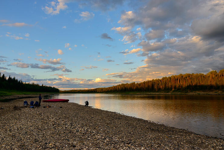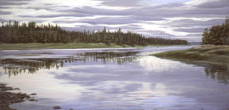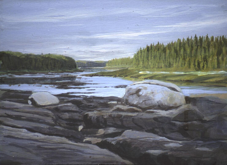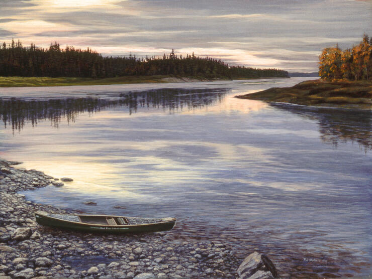 Looking back up at the last of the Missinaibi, 15 years after my dad and I first paddled the upper river, I again painted while tending dinner during what was for me the sublime end of a fabulous day. Happy with the evening field study, I decided to use it as the basis for a studio painting. I already had a title, River’s End. My dinner was shared with friendly Gray Jays and I retired for the night content.
