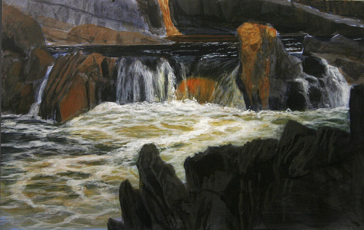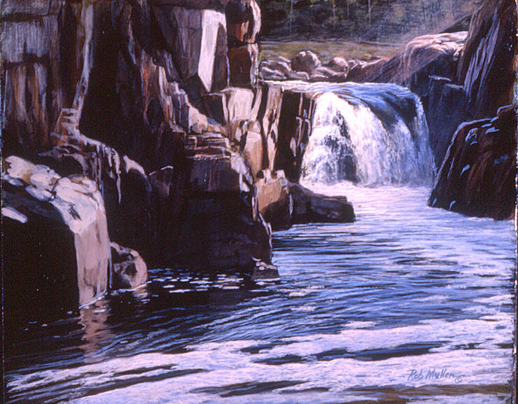 Frank’s duties as a Coast Guard officer prevented him from going that summer (he went with me in ’87), but Dad and I did 95 miles of the upper river to the Spruce Camp 95 bridge upstream of Mattice, Ontario in June. Even without reaching James Bay I was hooked; sensitized to the timeless, wild world that underlies all we know, almost peed on by a bull moose, chewed by mosquitoes, and bitten the wilderness art bug. Despite absurd hours in my Manhattan studio, I stayed up into the dawn for weeks to do two paintings. Canadian wilderness canoe trips became my regular summer tonic for urban life for the rest of my career in New York, and I have been painting wilderness rivers ever since.