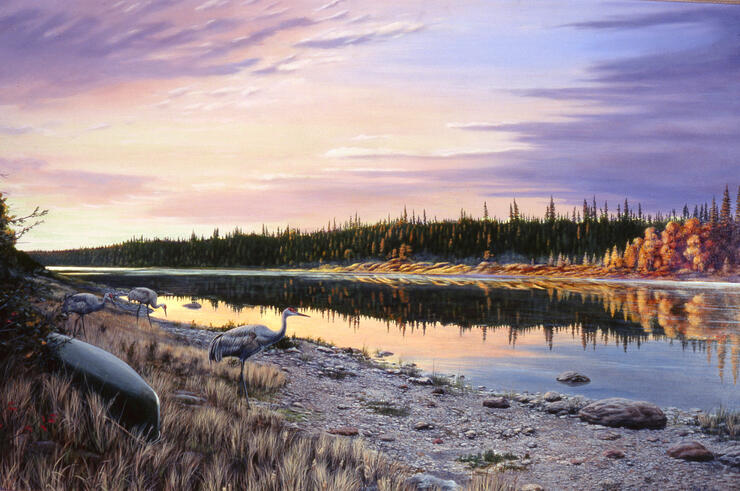 Seeing the gloriously rising light in the morning gave me an insight on how sun-worship arose. The Sandhill Cranes by my canoe were the most incredible icing I could have hoped for and the dawn begged to be painted. It would be a studio piece titled First Light. I did a fast color field sketch and got on the water. Deception Rapid lived up to its billing but was run without mishap, and 31 exhilarating miles later I set camp on Portage Island amid the confluence of the Missinaibi and Mattagami.
