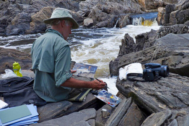 Assuming that no one else would be able to take the time to follow an artist’s itinerary, I planned to travel alone. However, at an art show opening in June 2001, John Pitcher asked to join me. John was (and still is) a leading U.S. wildlife artist and virtuoso field painter (plein air). We set off from Barclay Bay on Lake Missinaibi on August 24, 2001.