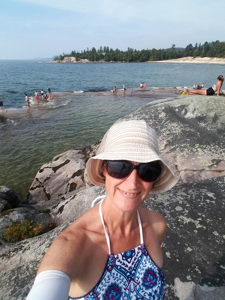 Lake Superior Provincial Park has lots to offer including endless shoreline, multiple waterfalls, and a variety of trails. Our favorite spot to visit on a warm day is Bathtub Island. You can walk there by trail south from the Katherine Cove parking area, but many people park right along the highway and take the shorter trail west through the trees to access the beach directly across from the island. From there, wade waist deep about 100 metres out to a small island of smooth rock on this inland sea. From there you can dip in shallow pools, climb up to an overlook, and sunbathe by the lapping waves.