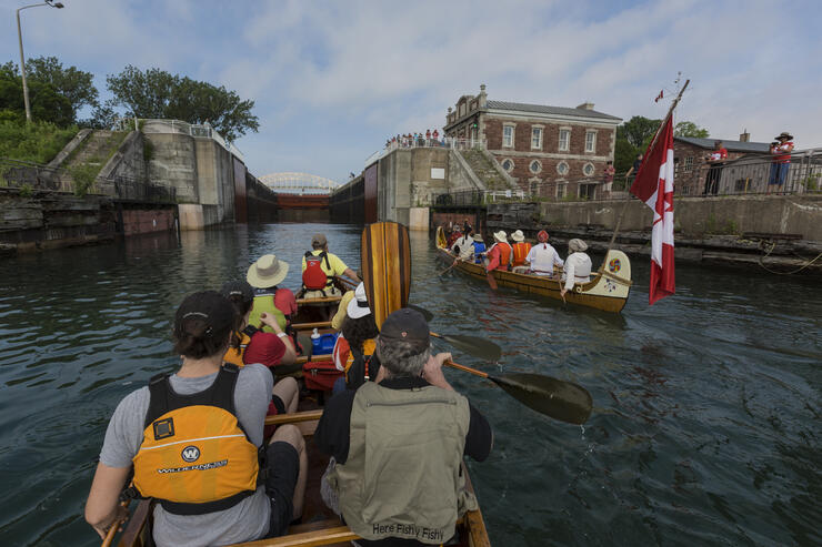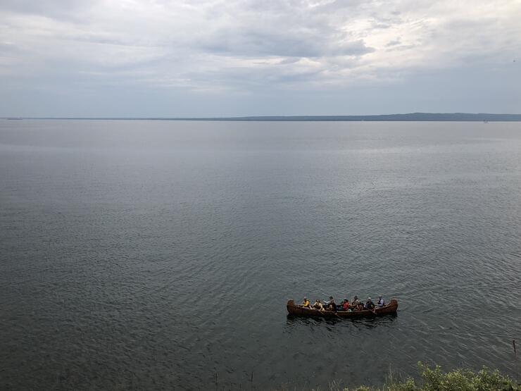 I was born and raised in Sault Ste. Marie, Ontario, along the shores of the St. Marys River. Some of my earliest memories are along this river and many of them are associated with the unknown and fear. That is why I am especially nervous as I carefully shift my weight from the dock along its shores into a canoe. My hand is steadied as a fellow paddler helps me settle into the wooden bench style seat next to hers. I am thankful to not only be guided on this canoe tour, but to get to experience this tour with another 14 paddlers in the same vessel.