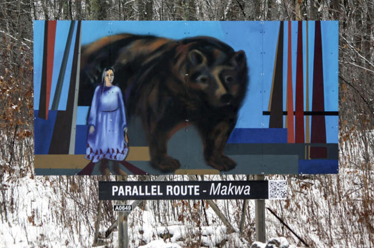 Sharon Hunter’s Parallel Routes series greets travellers driving into the Sault from the East. These billboard-sized murals line Highway 17, depict industrial imagery and wildlife. “My recent work has visually represented the tension between natural systems and human-imposed structure,” she explained.