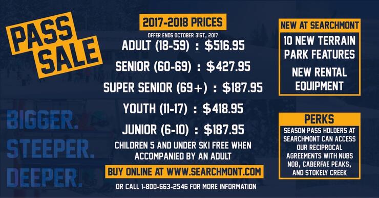 - Stokely Creek Lodge - Show your Searchmont Season Pass Card and enjoy 25% off a Stokely Creek Day Pass. Not valid on early and late season rates, no other discounts apply.
