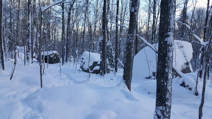 The trail is located in Goulais River, a 35-km drive up Highway 17 north of Sault Ste. Marie. There is highway signage before the turnoff onto Old Highway 17 which leads to Robertson Lake Rd. The trail starts at the snow machine parking lot, which is the last area that the road is plowed to. From there, the road is mainly accessed by snow machines. The new trail, which is blazed blue, starts across the road and follows the contours of the cliff base through the maple forest to the new parking area about 1 km or so east. To make a short loop, head back on the road. This takes roughly an hour and is an easy hike. Dogs are allowed off leash and the only traffic to be concerned about is snow machines heading down the road.