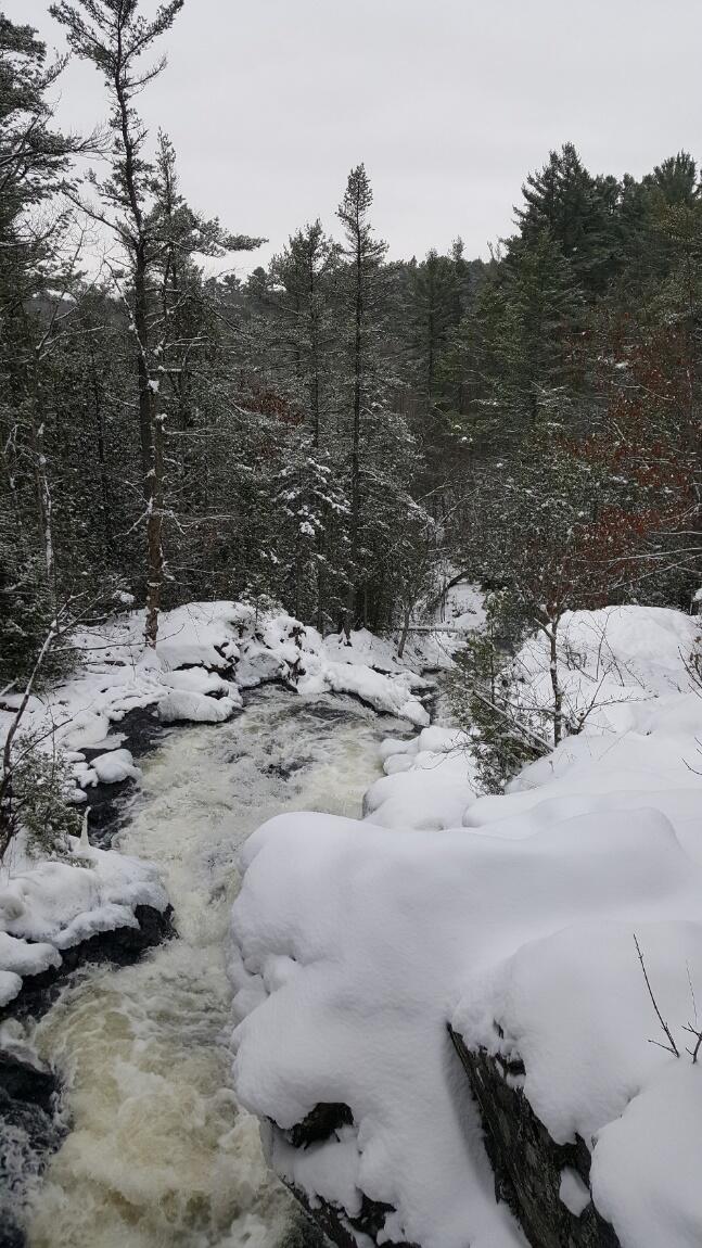 The Odena Loop is over 4 km long with many ups and downs, making for an interesting snowshoe through the bush. A shorter, easier option starts where the Conner Rd. extension crosses the yellow Odena Loop trail. Leave the parking lot through the gate and look for the yellow blazes. (Blaze descriptions can be found at the end of the blog.) Follow the blazes south of the road. The path brings you through a flat forested area, leading to a bridge that crosses Crystal Creek. On the other side, the yellow side trail ends where it meets the main trail. At this point you want to go west (right) following the white blazes. The path intersects with other trails such as the Hiawatha snowshoe trail which is indicated by little snowshoes on the trees. Stay with the white blazes and you will eventually reach the bridge over the upper Crystal Falls. Once you cross, continue on until you reach Conner Road at which point you head back to the parking lot by heading east or right.