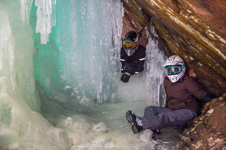Early-season ice forms at the shoreline, leaving many to believe it’s safe everywhere. Wrong. The best way to be safe on unknown ice conditions is not to follow other snowmobile tracks but instead, to don a life jacket or floater suit, ice picks, a floating rope, grab a friend or two, and literally cut holes in the ice. Pay particular attention to danger areas—where currents flow, depths change, trees and rocks that create spots where the ice is thin.