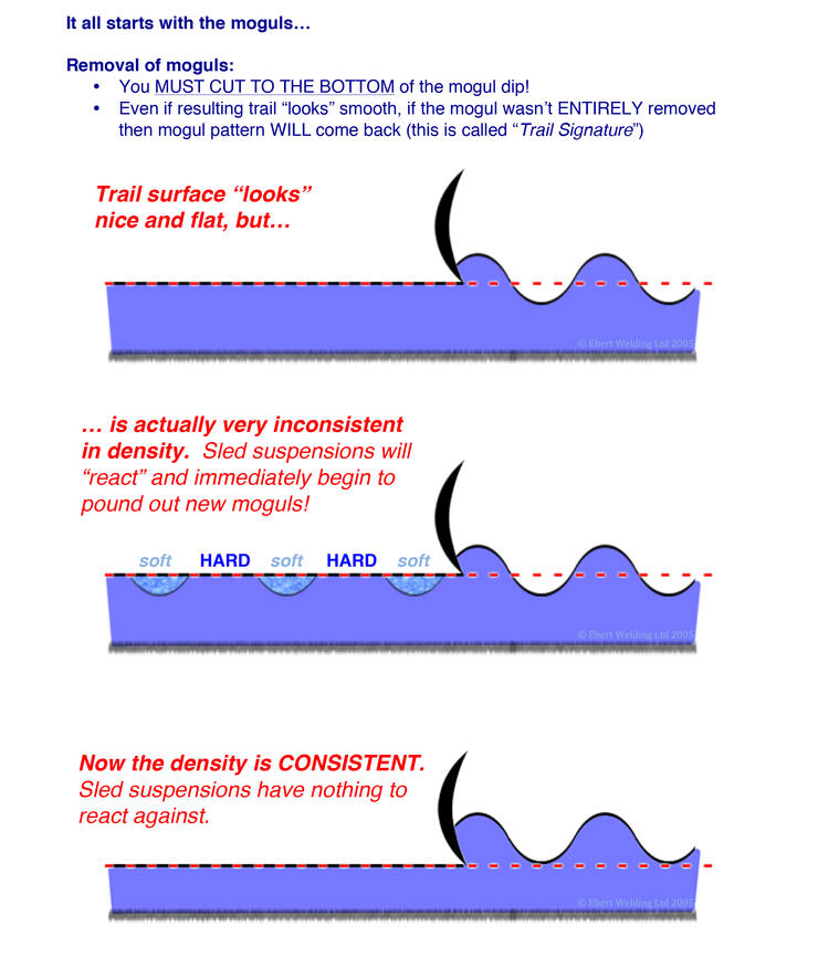 The travelling snowmobile suspension exerts downward pressure against the trail and will compact the soft snow in the rut, leaving a depression and pushing some of the snow on top of the previous high mogul, creating the same sequence of bumps and crevasses that existed prior to the grooming pass. Because of this, every operator needs to make sure they remove the mogul memory when grooming trails—if they don’t, the trail will always have the same bumps and ruts in the exact same places. Learn something new every day, huh? There’s so much that goes into maintaining the trails that those who use them rarely have the opportunity to really get to know.