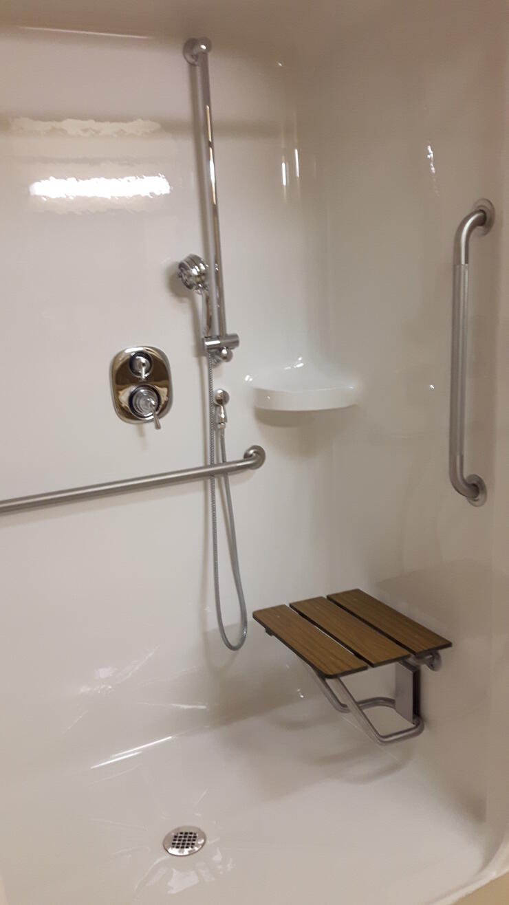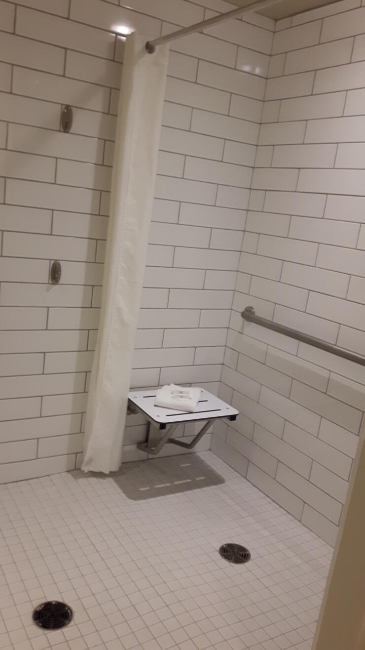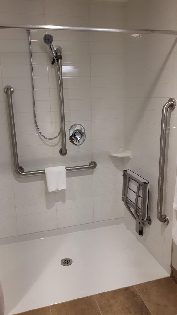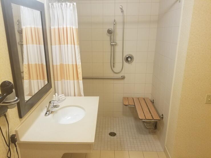Microtel Inn & Suites was, by far, the hotel with the most accessible rooms which included roll in showers. These rooms boasted larger entry-ways, more space in between beds, large roll in showers with a foldable seat, lower closet rods and lowered peep holes. The rooms even had an automated ‘push-button’ feature for convenient access in and out of the room, which was really impressive.