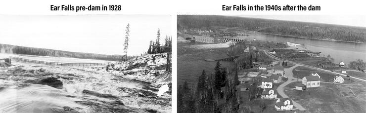 In 1928, Ontario Hydro built a dam at Lower Ear Falls, where Lac Seul flows into the English River, making it a reservoir. Over the next few years, water levels increased and then in 1935, increased again to present-day levels, which are about 10’ higher than the original levels.