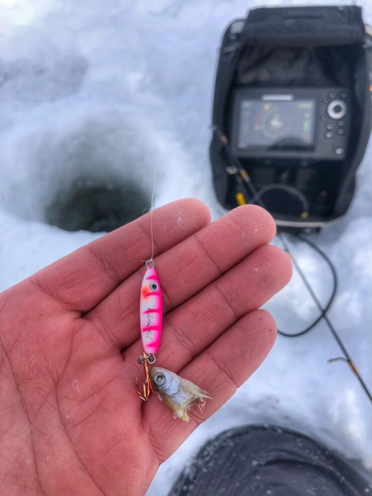 On the bigger waters, however, jigging with spoons or swimming jigs is tough to beat. Most of the time walleyes are going to be found near the bottom so electronics are not mandatory to catch fish but they will always help you put a few more on the ice. It’s good to know when walleyes are moving around beneath your hole and every once in a while, you’re going to see fish pass by that are slightly above the bottom so you can bring your bait up a bit so they can see it. More often than not, these suspended walleyes are aggressive and bite immediately.