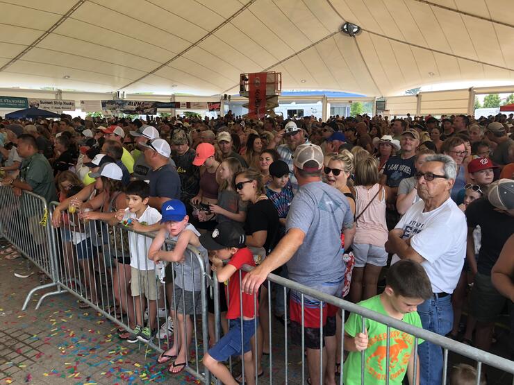 Saturday at 5 pm, the final day Top-10 Boat Parade through the tent is always a blast, with wall-to-wall spectators all eager to see who will be crowned this year’s KBI Champions. The kids get showered with candies and swag from the teams who get pulled through the tent in their boats, live-wells filled with their final day’s catch.
