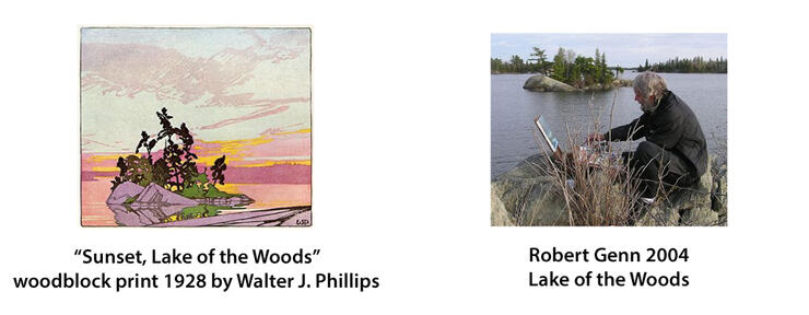 I met Robert Genn in BC about six years ago. We bonded over Lake of the Woods and became friends; he was also the greatest artistic mentor I’ve ever had. He had a really fun and interesting hobby too. He found spots where his favourite artists painted, then painted there himself. Like a treasure hunt! On Lake of the Woods, he looked for places Walter J. Phillips painted, based on rock formations and island layouts and set up there as well. He got me hooked on this game too. In 2004, Bob Genn found the island that Phillips captured in watercolour in 1926, and later made into a wood-block print called Sunset, Lake of the Woods.