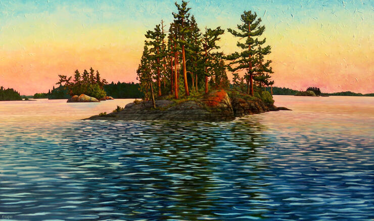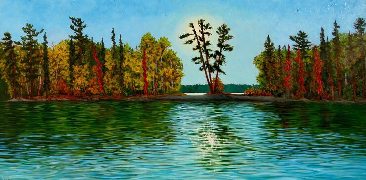 In 2011, I painted there as well. I unofficially named it “Phillips-Genn Islet,” although the islands in that area, like so many on Lake of the Woods, don’t have registered names. I’ve been back there several times, and started calling the island from which I painted "the Island of the Muse." It is particularly rich with inspiration, and I also feel the spirit of fellow artists who have gone before me when I’m there. I feel a part of the lineage of artists who have gone out and become a part of the world around them. Humbled by the scenery, inspired and reverent of those who went before. This last month I painted it on a larger scale, with “Phillips Genn Islet" in view from the “Island of the Muse.”
