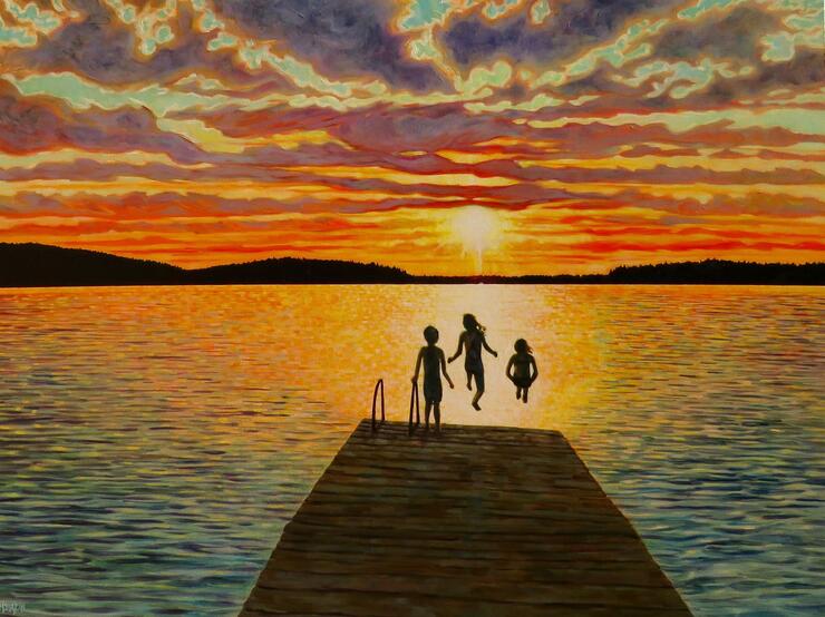 I have a little studio attached to my house, from which I paint almost every day. My technique is gathered from living here year-round: watching the change of seasons, appreciating every sunset and the beauty of a sunrise (which is slowly turning me into a morning person), swimming, paddle-boarding, exploring the lake by boat, and just being here. My technique is also based on three sources of gathering….